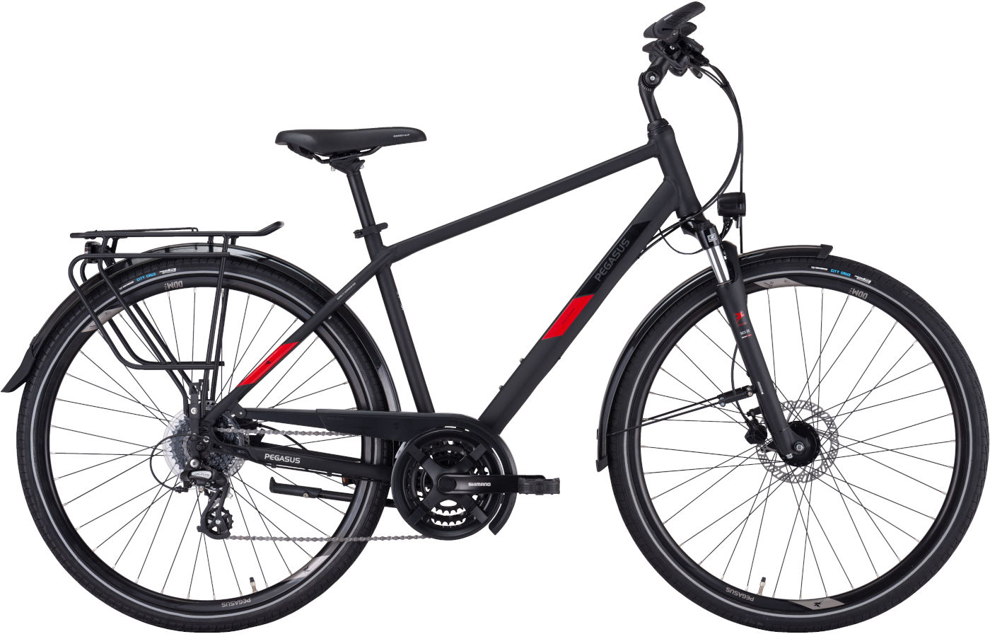 | Das PREMIO SL DISC von PEGASUS ist ein hochwertiges Trekkingbike der Extraklasse, welches sportliche Fahreigenschaften mit reichlich Komfort für den Einsatz im Alltag oder auch sportliche Touren verbindet. Die sportlich-entspannte Rahmengeometrie, mit steifem und aufwändig verarbeitetem Rahmen und der Integration von Zügen und Kabeln in das Innenrohr, sorgt für eine aufgeräumte Optik und eine langstreckentaugliche, angenehm aufrechte Sitzposition. Das PREMIO SL DISC ist äußerst bedienungsfreundlich. Die verbauten Materialien und Komponenten sind zudem allesamt wertig und auf lange Haltbarkeit ausgelegt. Die angenehme, ergonomische Lenkerform erhöht in Verbindung mit dem verstellbaren Vorbau, der gefederten Sattelstütze und dem bequemen Selle Royal Essenza PlusSattel den Fahrkomfort auf langen Strecken. Die Shimano Altus 24-Gang-Kettenschaltung bietet mit einer großen Übersetzungsbandbreite und feiner Abstufung eine optimale Schaltperformance. Unebene Strecken wie Forstwege und Trampelpfade werden durch die sensibel ansprechende SR Suntour Federgabel geebnet und sanft abgemildert. Für eine zuverlässige Bremsleistung, auch bei hohem Gewicht, widriger Witterung und hoher Geschwindigkeit, sorgen die gut dosierbaren, hydraulischen Scheibenbremsen von Tektro. Die helle Fuxon LED-Lichtanlage mit 50 Lux Strahler, Standlicht-Automatik und ausfallsicherem Shimano Nabendynamo leuchtet Deinen Fahrweg optimal aus und erhöht Deine Sichtbarkeit im Straßenverkehr. Ein weiteres Plus an Fahrsicherheit bietet Dir die breite VeeTire City Cruz Bereifung mit Reflexstreifen. Praktische Komponenten wie stabile Schutzbleche, Hinterbauständer und solider MonkeyLoad-Systemgepäckträger, an welchem sich komfortabel weitere Taschen und Körbe anbringen lassen, runden die hochwertige Ausstattung des PREMIO SL DISC ab. |
