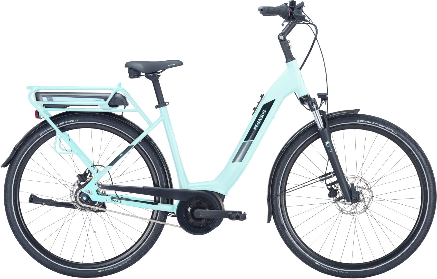 Mit dem SOLERO E8R PLUS von PEGASUS legen Alltags- und Freizeitfahrer den perfekten Start hin. Das SOLERO E8R PLUS ist ein tolles City-E-Bike mit einem hervorragenden Preis-Leistungs-Verhältnis. Dabei ist es dank des sportlich-harmonischen Active Line Plus Motor von Bosch und dem leistungsstarken Bosch PowerPack Akkus mit einer Kapazität von 500 Wattstunden egal, welches Ziel du anvisierst. Als Fahrer sitzt du in einer guten und variablen Position und bleibst gleichzeitig in Bewegung. Der Lenkervorbau ist verstellbar und lässt sich einfach und bequem an deine individuellen Bedürfnisse anpassen. Der Motor unterstützt dich harmonisch mit einer angenehmen Laufruhe und der in den Gepäckträger integrierte Akku ist zum Laden jederzeit bequem erreichbar. Der breite und tiefe Durchstieg ermöglicht einen schnellen und komfortablen Auf- und Abstieg vom Rad. Die sportliche Shimano Nexus 8-Gang-Nabenschaltung mit Rücktrittbremse bietet präzise Schaltvorgänge. Die robusten und pflegeleichten hydraulischen Scheibenbremsen von Tektro greifen kräftig zu und sorgen für zuverlässige Entschleunigung. In Verbindung mit dem aufwändigen und verwindungssteifen Rahmen sorgt dies für ein besonders sicheres Fahrverhalten. Mit pannensicherer Supero Optima Safe Bereifung mit Reflexstreifen und gefedertem Vorderrad auf Asphalt, Schotterwegen oder über gepflasterte Passagen dank SR Suntour Federgabel mit 75 mm Federweg. In Verbindung mit dem bequemen Selle Royal Essenza Plus Sattel macht da eine Stadt-Land-Fluss-Fahrt richtig Spaß. Zumindest jenen, die „aktiv“ und „bequem“ nicht als Gegensätze ansehen. Auf dem serienmäßig eingebauten Intuvia Display von Bosch kannst du jederzeit alle relevanten Informationen zu Leistung und Verbrauch deines SOLERO E8R PLUS ablesen und behältst so immer die volle Kontrolle und Übersicht. Die extrem helle Lichtanlage von Fuxon mit Front- und Rücklicht lässt dich darüber hinaus garantiert nicht im Dunkeln stehen. |