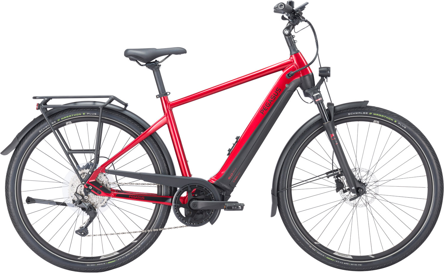 | Mit Bestnoten und zahlreichen Auszeichnungen gehört das PREMIO EVO 10 LITE zu den Bestsellern von PEGASUS und Deutschlands meistverkauften und vielfältigsten E-Bikes. Es ist ein zuverlässiges und ansprechendes Allrounder E-Trekkingbike und dank hochwertiger Ausstattung und hervorragendem Fahrkomfort ist es besonders für lange Tagestouren geeignet. Dabei verbindet es die Einsatzbereiche Stadt und Trekking. Ambitionierte Tourenfahrer werden auf anspruchsvollen Streckenprofilen ihren wahren Spaß mit dem PREMIO EVO 10 LITE haben. Der besonders bequeme Comodoro Comfort Sattel mit vibrationsdämpfendem Hydrofoam-Polster passt sich anatomisch Deinem Gesäß an und mit dem höhen- und winkelverstellbaren, gebogenen Lenker lässt sich eine entsprechend komfortable Sitzposition einstellen. Die robuste SR Suntour Federgabel mildert Stöße auf unwegsamem Gelände ab. Der Bosch PowerTube Akku mit einer Kapazität von 750 Wattstunden ist formschön in das Unterrohr integriert und garantiert Dir lange Reichweiten. Der kraftvolle aber harmonische Bosch Performance Line CX Motor unterstützt Dich dabei mit einem sportlichen Antritt und die Shimano Deore 10-Gang Schaltung sorgt für die optimale Schaltperformance. Dank hydraulischer Shimano-Scheibenbremsen hast Du das Bike jederzeit fest im Griff und bringst es sicher zum Stehen, auch bei nassem Untergrund. Die SCHWALBE Marathon E-Plus Performance Smart DualGuard Bereifung bietet ordentlich Grip auf asphaltierten Straßen und genügend Traktion abseits befestigter Wege, während die helle LED-Lichtanlage von Fuxon Deinen Fahrweg optimal ausleuchtet und Deine Sichtbarkeit im Dunkeln und im Straßenverkehr deutlich erhöht. Eine echte Innovation stellt das MonkeyLoad-Gepäckträgersystem dar, an welchem sich mit Leichtigkeit Satteltaschen einrasten lassen oder auch ein hochwertiges Abus-Schloss befestigt werden kann. Das serienmäßig eingebaute Intuvia 100 Display von Bosch zeigt Dir während der Fahrt übersichtlich und beleuchtet alle relevanten Fahrinformationen zu Leistung und Verbrauch an. Zudem kannst Du hier bequem die vier verschiedenen Unterstützungsmodi anwählen. |
